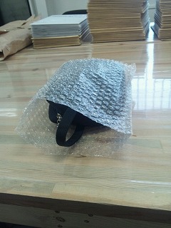 大きなエアーパッキンを商品のサイズに寄って加工して使っております。