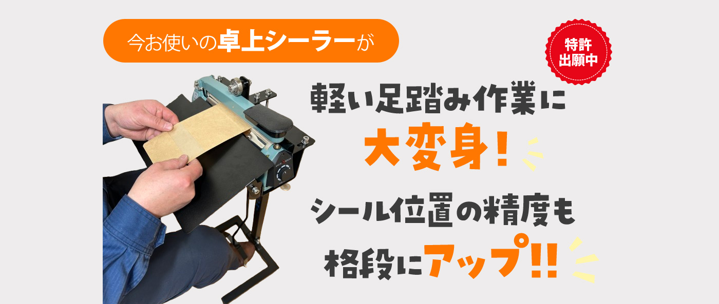 お客さまのお悩みから誕生した「卓上シーラーを足で踏むこともできる装置」です。