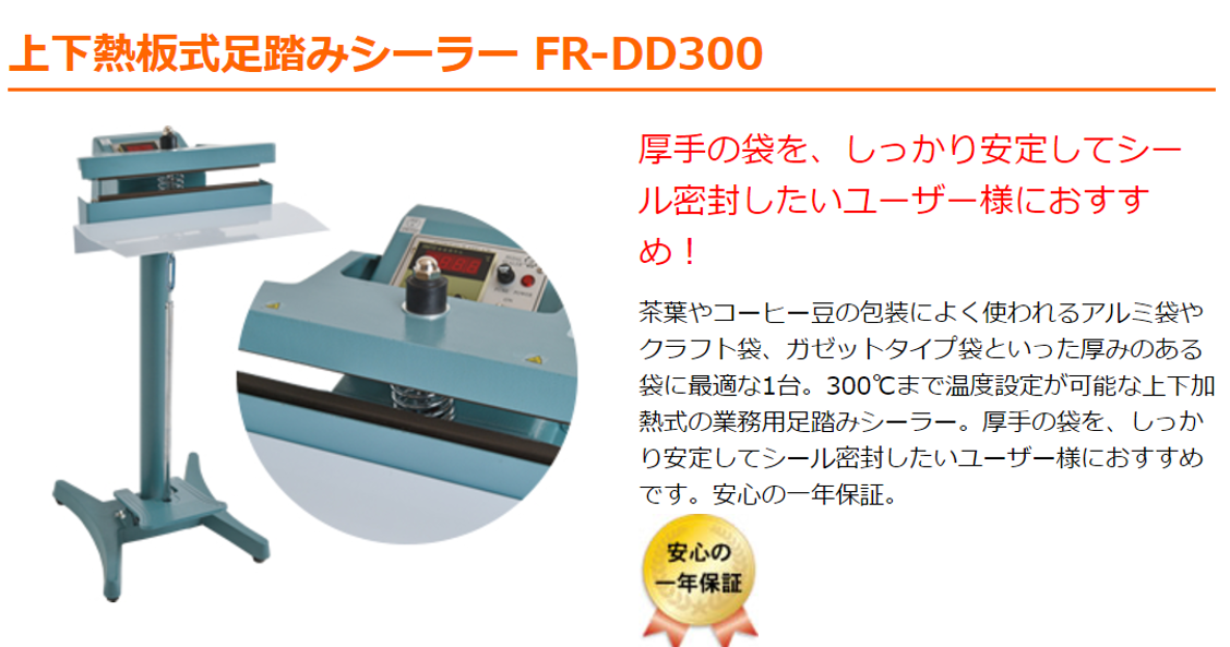 業務用足踏みシーラーをご検討のお客様で、厚手のアルミ袋、クラフト袋、ガゼット袋、茶葉を入れる袋、コーヒー豆を入れる袋にご利用をお考えの方は、ぜひFR-DDシリーズのテストシールをお申し込みください。